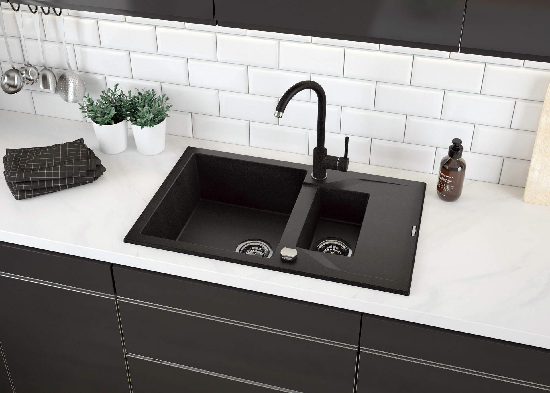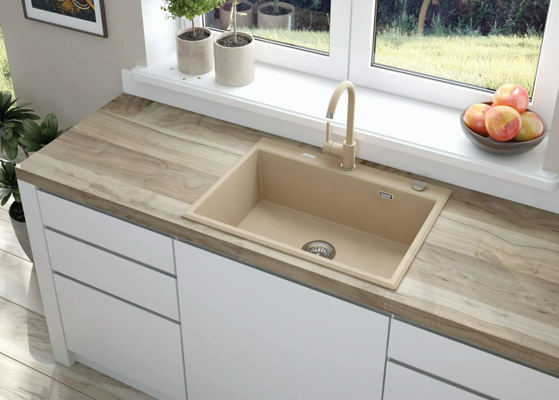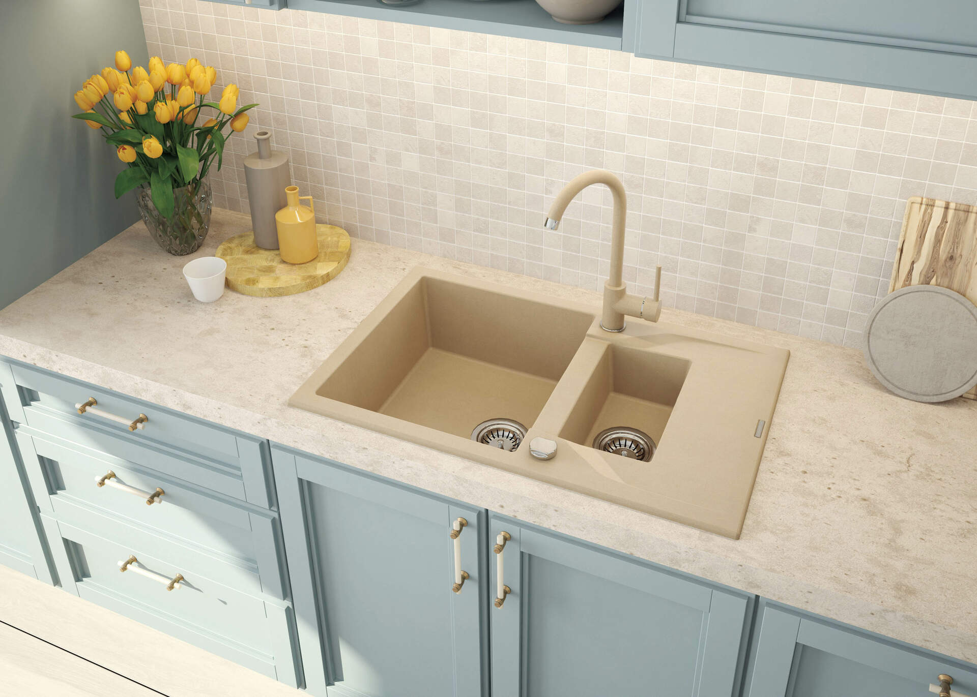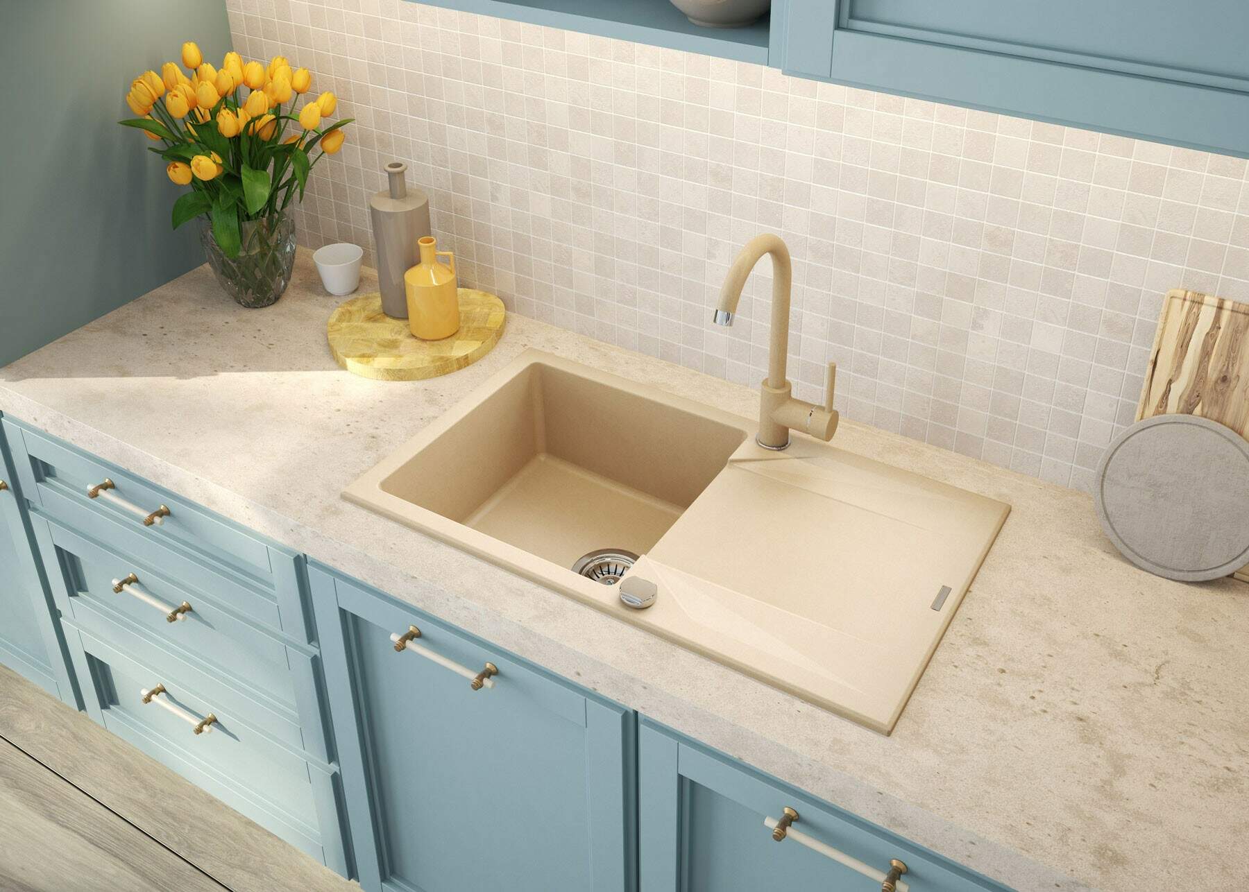 Funkcjonalna bateria kuchenna zaprojektowana została z myślą o wysokiej użyteczności oraz estetycznym wyglądzie. Elegancki design sprawia, że pasuje do wnętrz nowoczesnych, ale też skandynawskich czy bardziej tradycyjnych. Bateria zlewozmywakowa posiada aerator, który redukuje życie wody, co przy ręcznym myciu naczyń jest bardzo istotne. Dodatkowo napowietrzony strumień jest bardziej miękki.