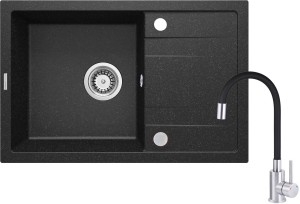 Zlewozmywak granitowy z baterią tworzy kompletny zestaw do kuchni. Powstał z wytrzymałego, naturalnego granitu, który jest odporny nie tylko na wysoką temperaturę i jej wahania, ale także na uderzenia i przebarwienia, zgodnie z normą europejską PN-EN 13310. Dodatkowo został wzbogacony warstwą hydrofobową, ułatwiającą spływanie pojedynczych kropel. W tej samej kolorystyce jest też bateria z wygodną wylewką. Jest to model z praktyczną, elastyczną wylewką. Przelew w komorze zabezpiecza blat i kuchnię przed zalaniem. Nadmiar wody sprawnie zostaje odprowadzony do syfonu.