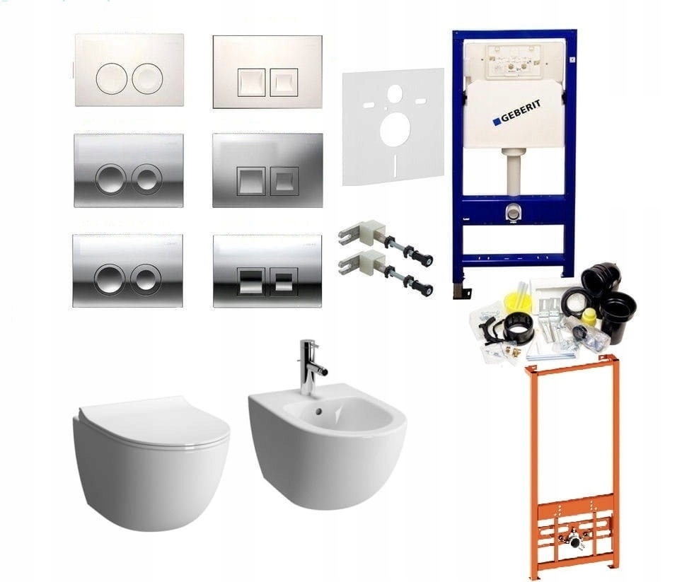 składa się z miski WC rimless + wolnoopadającej deski sedesowej ( do wyboru )+ bidet + stelaż do bidetu polska produkcja + stelaża podtynkowego GEBERIT+ przycisku GEBERIT ( do wyboru ) + wspornika Geberit.