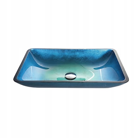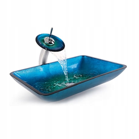 Zestaw umywalka nablatowa niebieska szklana 56 cm + elegancka wysoka niebieska bateria typu wodospad + zestaw montażowy do szklanych umywalek.