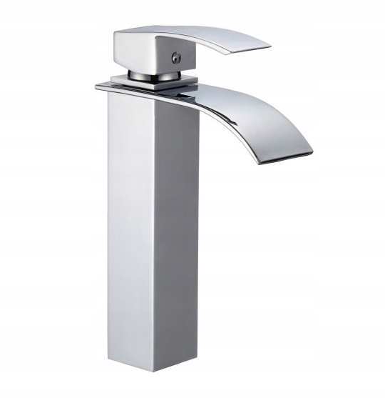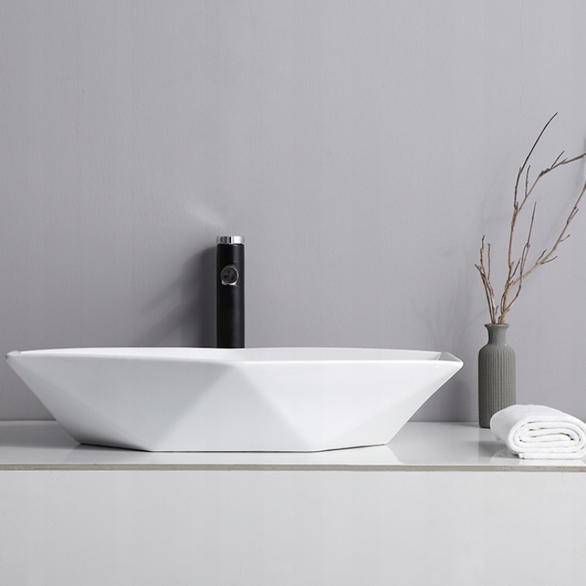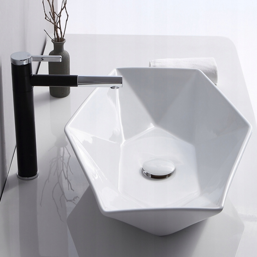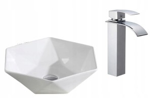 Zestaw umywalka nablatowa pięciokątna ceramiczna 41x48 cm+ elegancka wysoka bateria umywalkowa z efektem wodospadu.