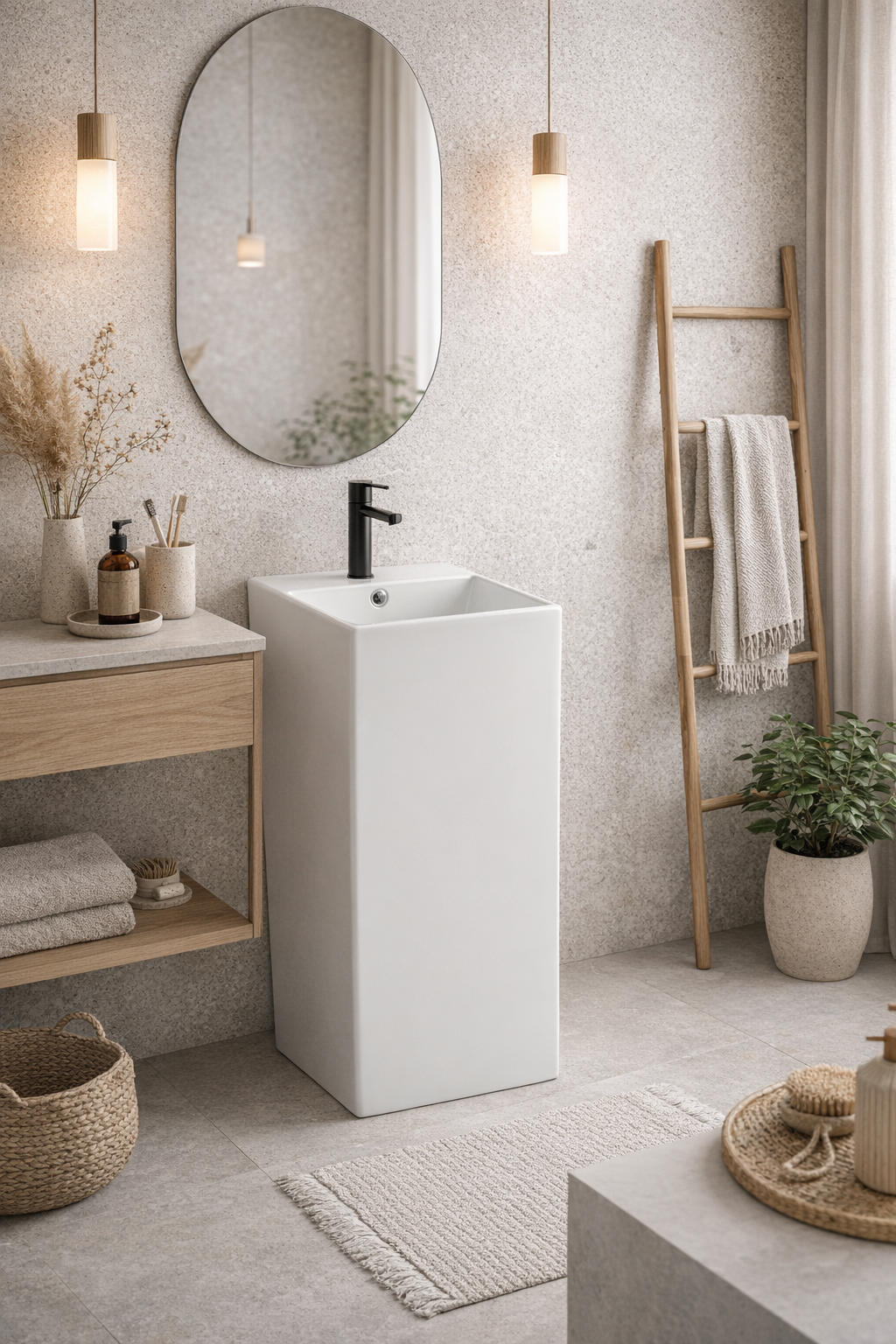 Umywalka wolnostojąca Brillante Mono 83 cm to nowoczesny model wykonany z wysokiej jakości ceramiki sanitarnej. Minimalistyczna forma, kompaktowy rozmiar i eleganckie wykończenie sprawiają, że idealnie pasuje do łazienek nowoczesnych, Japandi i minimalistycznych